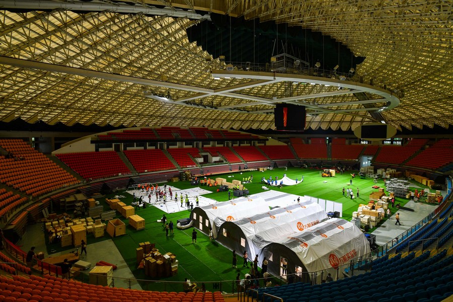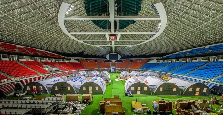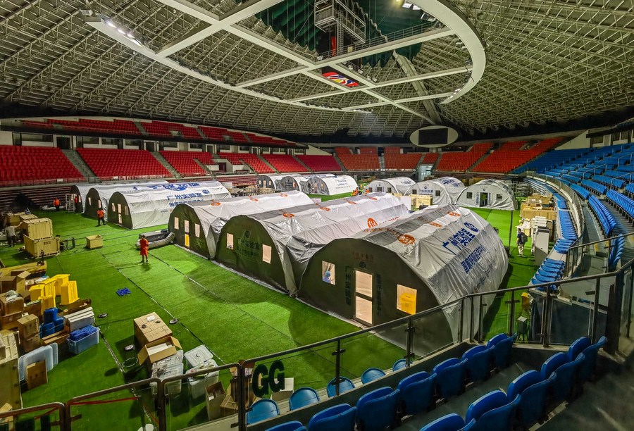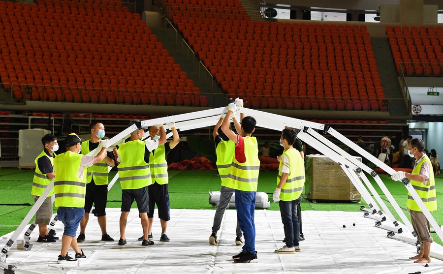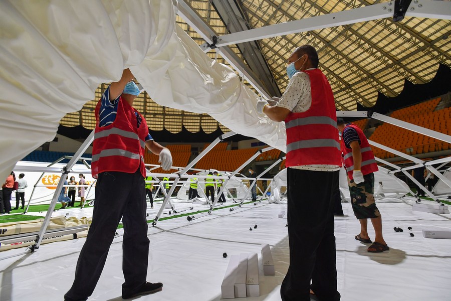 Builders set up the frame for a temporary laboratory for nucleic acid testing in a stadium in Guangzhou, capital of south China's Guangdong Province, June 1, 2021. (Xinhua/Liu Dawei)