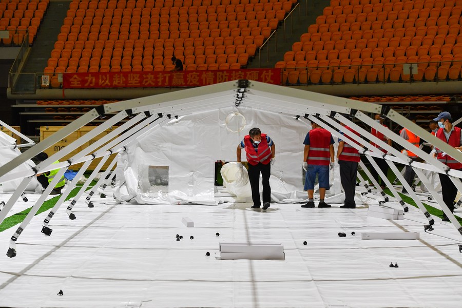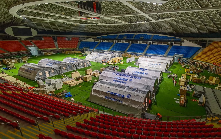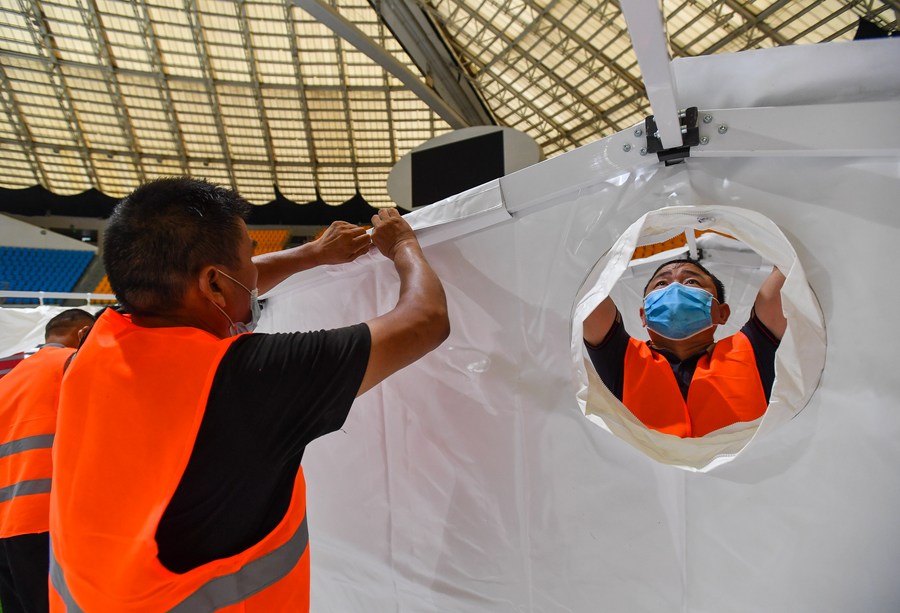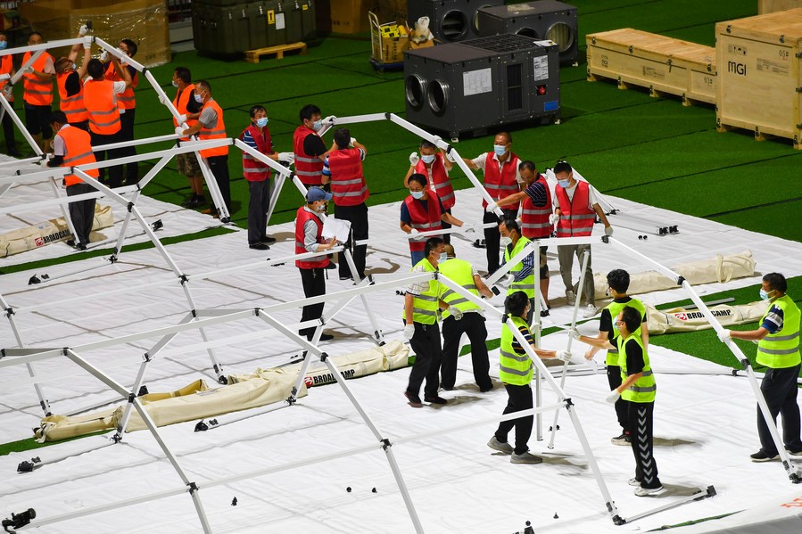 Builders set up temporary laboratories for nucleic acid testing in a stadium in Guangzhou, capital of south China's Guangdong Province, June 1, 2021. (Xinhua/Liu Dawei)