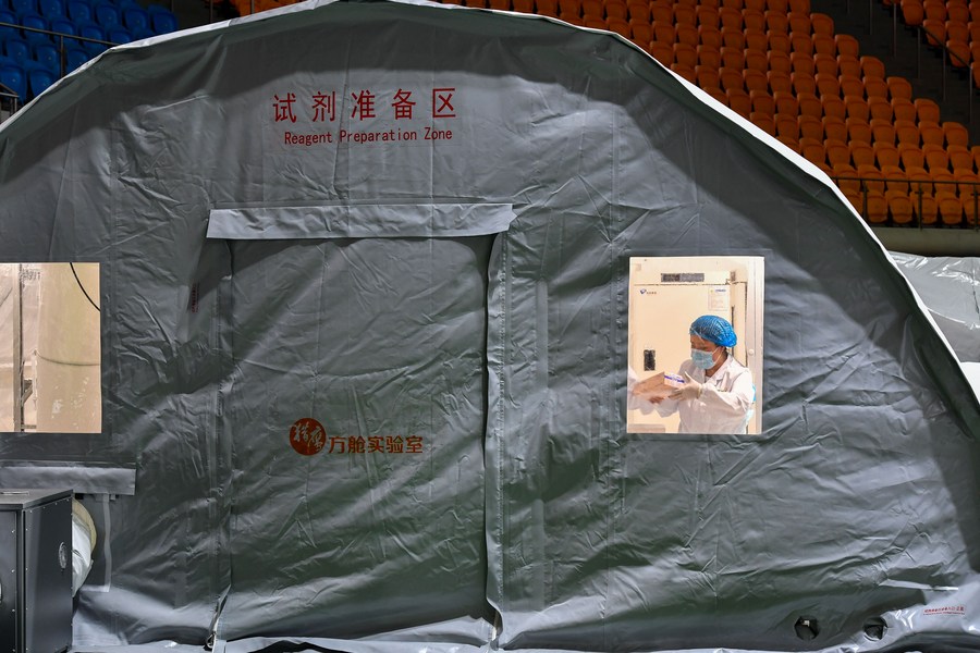 A staff member prepares the reagent for nucleic acid testing at a temporary laboratory in a stadium in Guangzhou, capital of south China's Guangdong Province, June 1, 2021. (Xinhua/Liu Dawei)