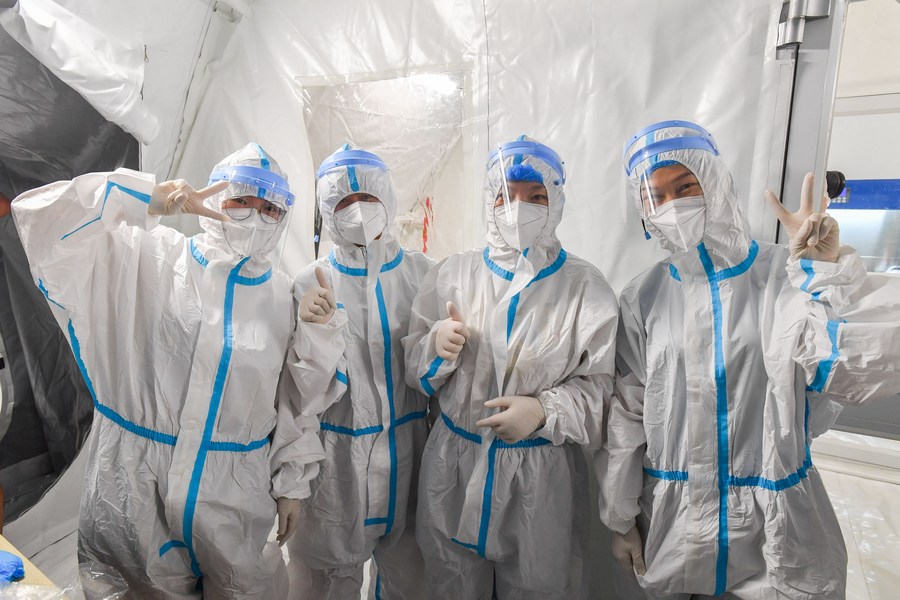 Staff members wearing protective suits pose for photos before entering the sample treatment area of a temporary laboratory for nucleic acid testing in a stadium in Guangzhou, capital of south China's Guangdong Province, June 1, 2021. (Xinhua/Liu Dawei)