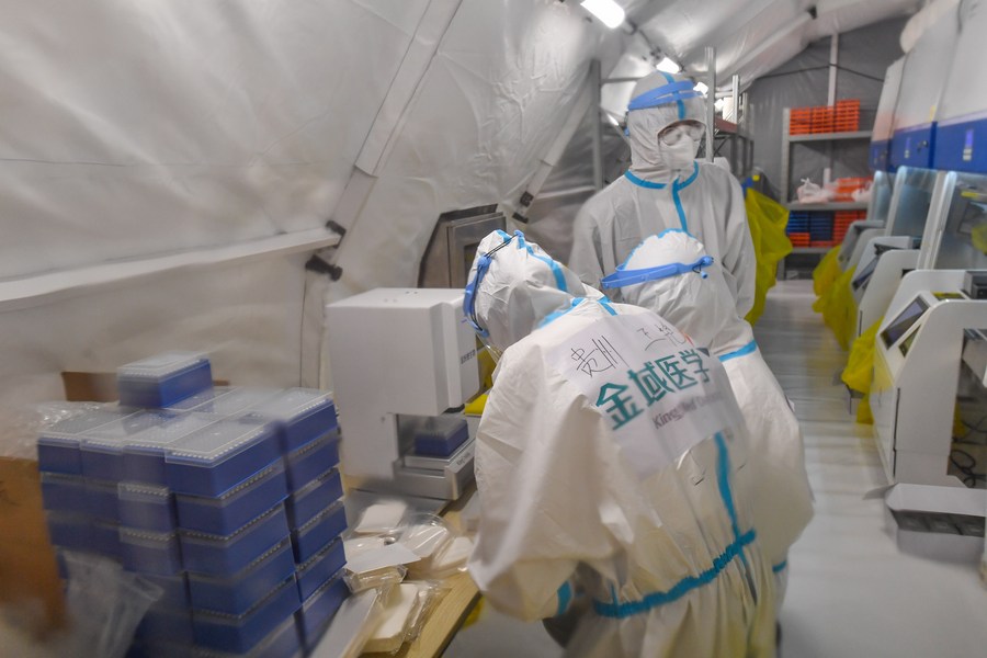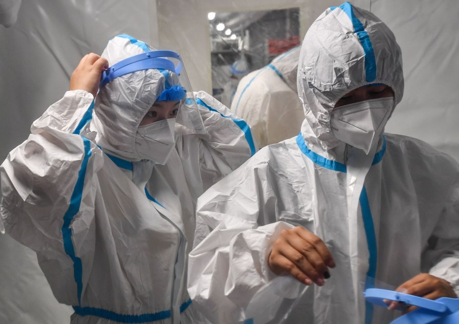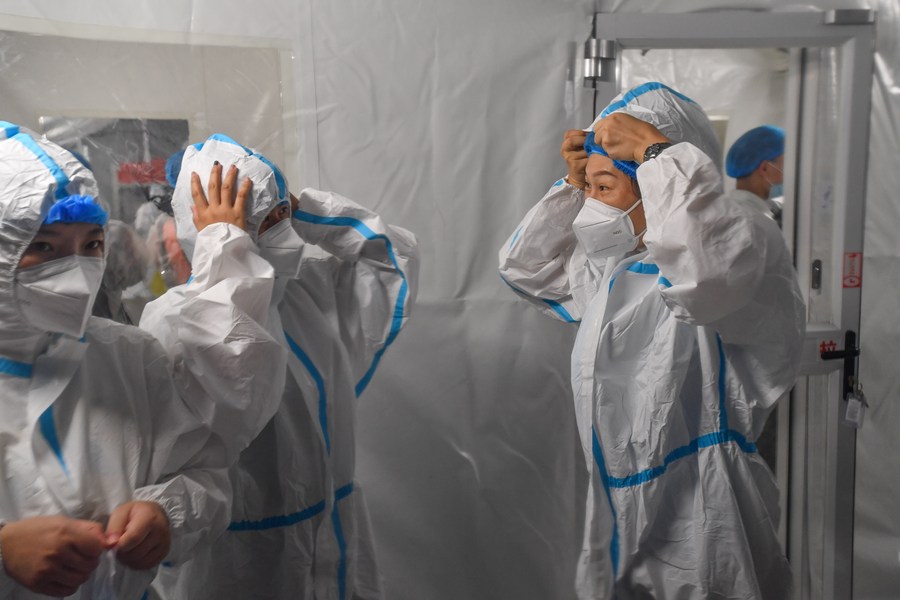 Staff members wear protective suits before entering the sample treatment area of a temporary laboratory for nucleic acid testing in a stadium in Guangzhou, capital of south China's Guangdong Province, June 1, 2021. (Xinhua/Liu Dawei)