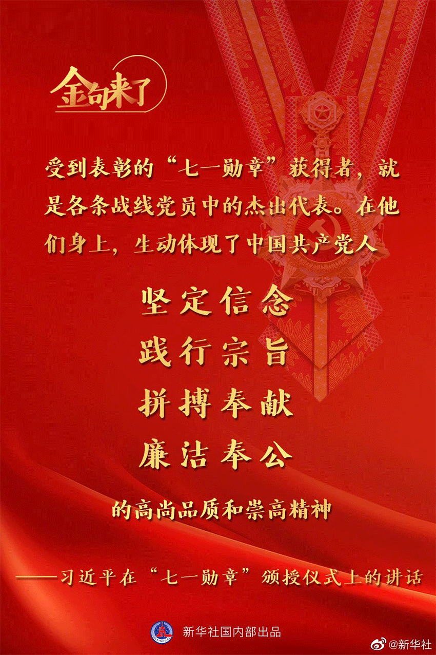 6月29日,庆祝中国共产党成立100周年“七一勋章”颁授仪式在北京人民大会堂金色大厅隆重举行。中共中央总书记、国家主席、中央军委主席习近平向“七一勋章”获得者颁授勋章并发表重要讲话: