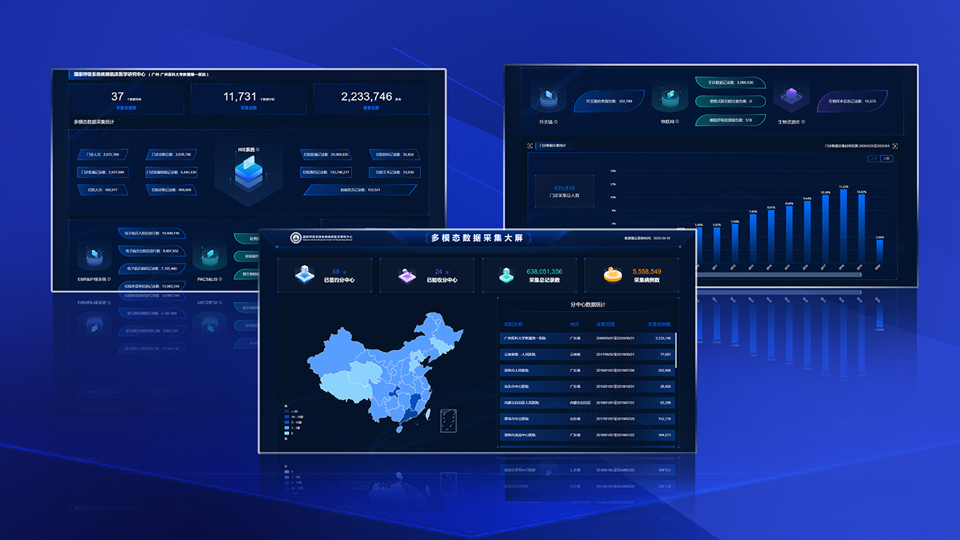 数据采集大屏:统计各分中心内各医疗系统业务数据和检验设备数据的采集情况。