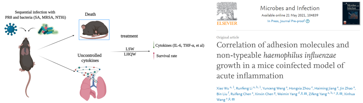 [5] Wu X, Li R, Weng Y, Zhou H, Jiang H, Zhao J, Liu B, Chen R, Chen X, Yang W, Yang Z, Wang X. Correlation of adhesion molecules and non-typeable haemophilus influenzae growth in a mice coinfected model of acute inflammation. Microbes Infect. 2021 May 20:104839. doi: 10.1016/j.micinf.2021.104839. Epub ahead of print. PMID: 34023525.