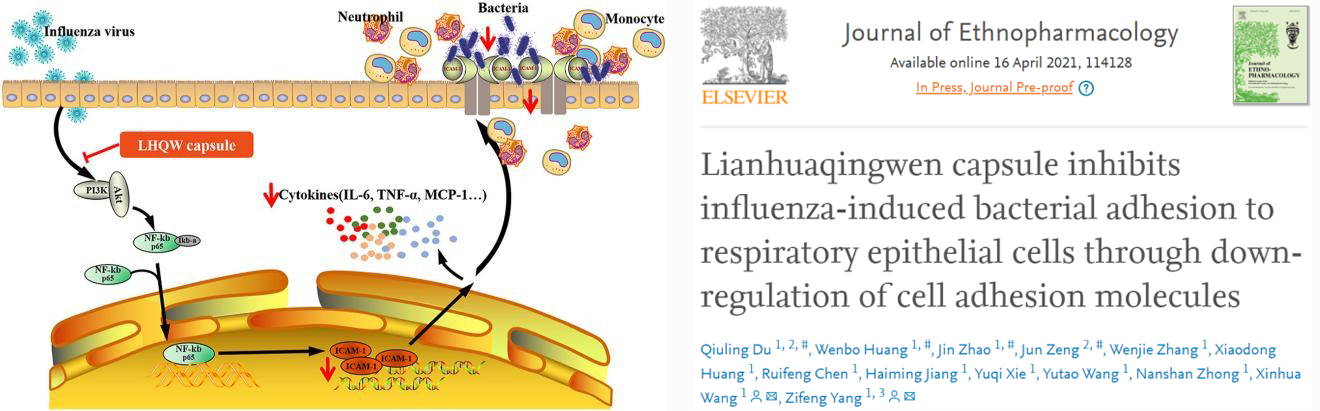 [4] Du Q, Huang W, Zhao J, Zeng J, Zhang W, Huang X, Chen R, Jiang H, Xie Y, Wang Y, Zhong N, Wang X, Yang Z. Lianhuaqingwen capsule inhibits influenza-induced bacterial adhesion to respiratory epithelial cells through down-regulation of cell adhesion molecules. J Ethnopharmacol. 2021 Apr 16:114128. doi: 10.1016/j.jep.2021.114128. Epub ahead of print. PMID: 33872750.