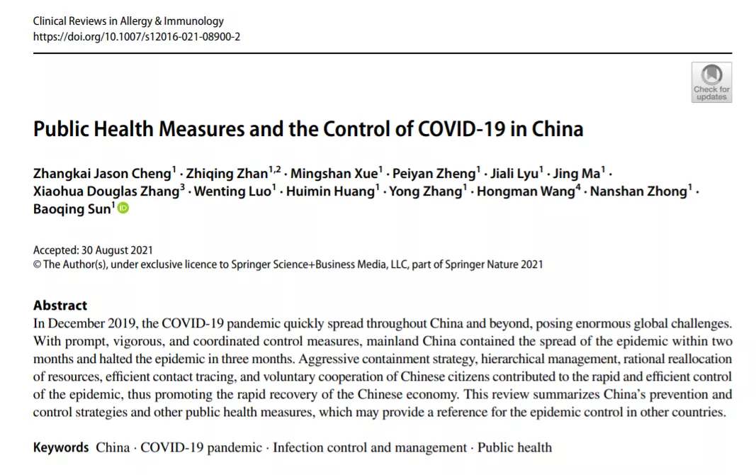 近日,国家呼吸医学中心、广州医科大学附属第一医院、广州呼吸健康研究院、国家呼吸系统疾病临床医学研究中心钟南山院士和孙宝清教授团队在国际学术期刊Clinical Reviews in Allergy and Immunology 发表题为《中国的公共卫生措施与新冠肺炎疫情防控》(Public Health Measures and the Control of COVID-19 in China)的文章(https://doi.org/10.1007/s12016-021-08900-2),首次系统性整合我国疫情期间的管控策略。在钟南山院士和孙宝清教授的指导下,程章恺、詹芷晴、薛明汕等博士对国家,各省市,社区,企业及个人层面在新冠肺炎疫情不同阶段所采取的不同防控策略和措施进行了整理和总结,旨在分享具有中国特色的防疫经验。