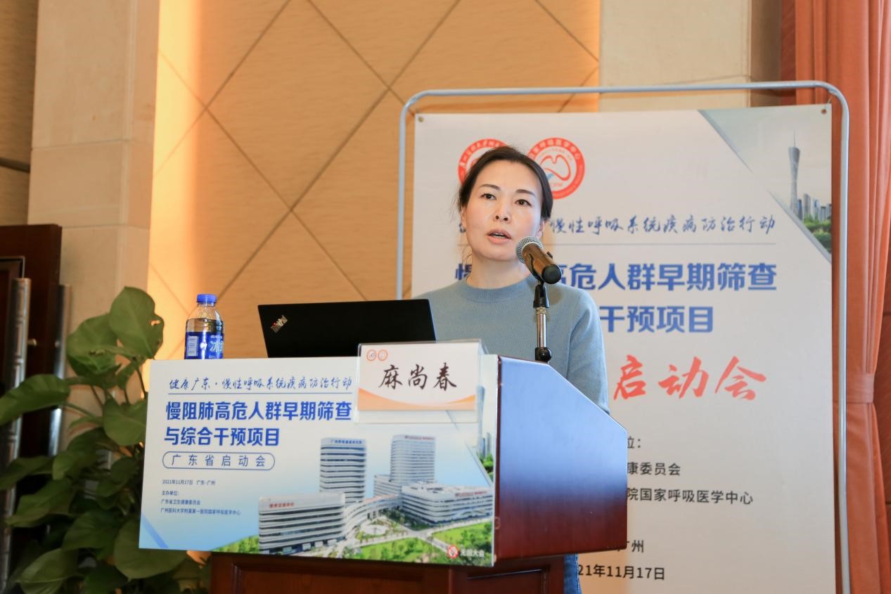 麻尚春处长在致辞中表示,从疾控的角度,慢性呼吸系统疾病以其高发病率、高死亡率、病程长、合并症多的特征成为严重影响我省居民健康的慢病之一。广医附一院去年负责组织实施全省基层呼吸系统疾病早期筛查干预能力提升项目,为广东省50%的基层医疗卫生机构试点配备肺功能仪和培训卫生人员掌握肺功能检查技术。今天的项目,是在5个项目点进行慢阻肺高危人群早期筛查与综合干预,具体有健康宣教,健康筛查,随访干预等措施,延缓疾病发生发展,降低患者疾病负担。各行政部门要积极提供帮助,各方要牢固全人群大健康的观念,切实推动健康广东慢性呼吸系统疾病防治行动进展。