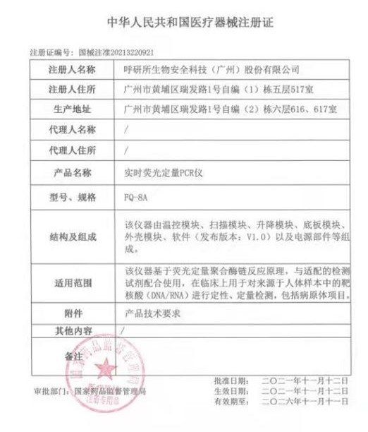 在钟南山院士、何建行院长及多位专家的指导和支持下,由呼吸疾病国家重点实验室、国家呼吸系统疾病临床医学研究中心周荣研究员/刘文宽副研究员团队联合广州实验室及产学研基地专项转化企业--呼研所生物安全科技(广州)股份有限公司协同开发的超快速荧光定量PCR仪于2021年11月12日获批国家三类医疗器械注册证(国械注准:20213220921)。