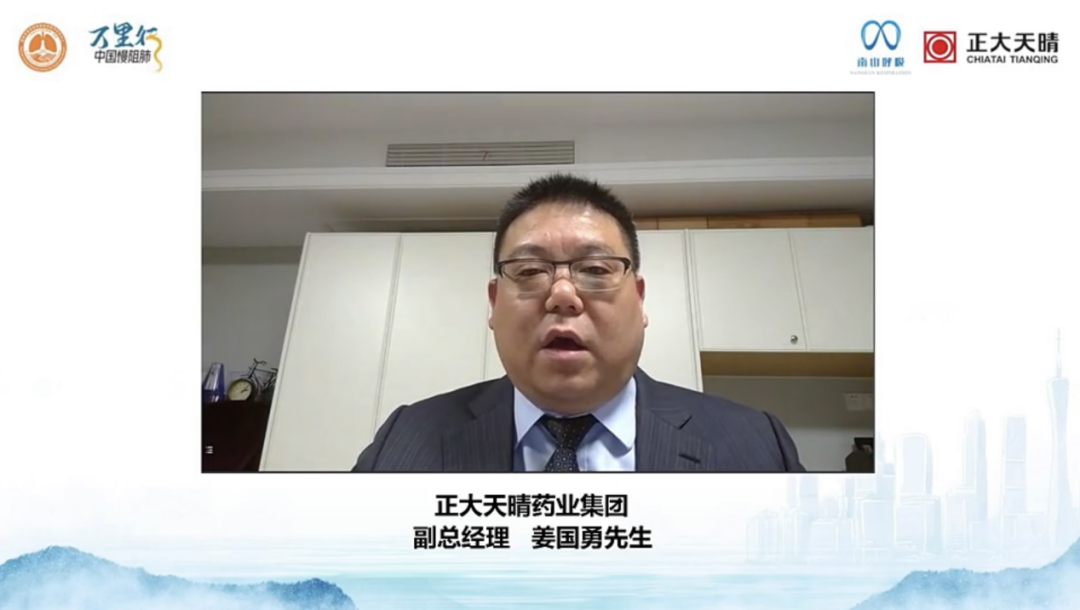 随后,正大天晴药业集团副总经理姜国勇先生致辞。作为项目支持方的代表,姜先生表示正大天晴是国内呼吸领域重要的创新型企业,有责任和义务呼吁更多人关注慢阻肺。未来正大天晴会积极承担企业的社会责任,用实际行动践行“健康科技,温暖更多生命”的企业宗旨,致力于提供更好的治疗方案,为国人呼吸健康贡献一份力量。