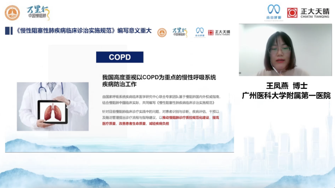 本项目核心骨干、广州呼吸健康研究院王凤燕博士对《慢阻肺临床诊疗质控规范化交流项目》建设建议进行了详细的解读。本项目对三级医院、二级医院和基层医院的设备配置、人员资质、诊疗能力及疾病管理提出了不同的建议,细则中给予详细描述。此外,对慢阻肺诊疗规范流程也提出了明确的建议。