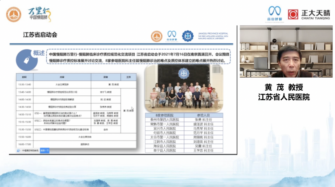 江苏省人民医院呼吸与危重症医学科主任、中华医学会呼吸病学分会委员、哮喘学组委员、江苏省医学会呼吸病学分会主任委员、慢阻肺组长、江苏省中西结合分会呼吸专业委员会主任委员黄茂教授与大家分享了江苏省慢阻肺质控规范化工作。