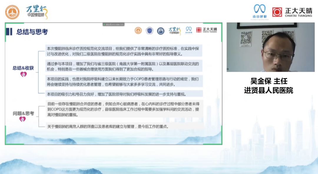 随后,江西省进贤县人民医院呼吸科主任、江西省研究型医院学会呼吸分会委员、江西省研究型医院呼吸介入分会委员、江西省整合医学会呼吸分会委员吴金保主任分享江西省进贤县人民医院的慢阻肺质控规范化工作。