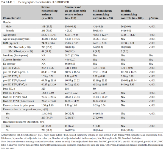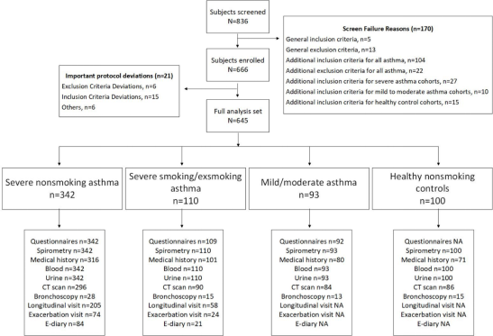 本研究招募了2015~2018年期间来自全国15个省33家医院符合ERS/ATS标准定义的重度哮喘患者,并纳入轻/中度哮喘患者和健康对照志愿者。共645例受试者分为:非吸烟重度哮喘患者组(NSA;n=342)、吸烟及戒烟重度哮喘患者组(SSA;n=110)、轻/中度哮喘患者组(MMA;n=93)及健康对照组(HC;n=100)。总结各组临床特点(人口统计学信息、急性加重情况、专项问卷)、生理指标(肺功能)以及炎症标志物(包括血嗜酸性粒细胞计数、血清IgE、呼出气一氧化氮分数、诱导痰细胞学分类等)的特征及分析组间差异。另外,研究在基线评估后的12-15个月对重度哮喘患者进行随访,观察上述指标的动态变化。