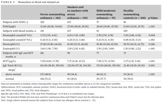 为探讨炎症因子在重度哮喘中发挥的作用,研究纳入分析的相关指标包括:血嗜酸性粒细胞计数(BEC)、血中性粒细胞计数(BNC)、血嗜酸性粒细胞阳离子蛋白(ECP)、呼出气一氧化氮分数(FeNO)、血清总IgE及诱导痰细胞学分类——嗜酸性粒细胞比例(SEC%)及嗜酸性粒细胞比例(SNC%)。