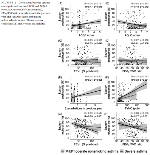 (2)相关性分析:在NSA及SSA组中,SEC%与FENO、近1年急性加重次数、AQLQ评分、ACQ5评分显著相关;SNC%与FEV1占预计值百分比及FEV1 /FVC呈负相关,而在MMA组中上述指标均无显著相关性。